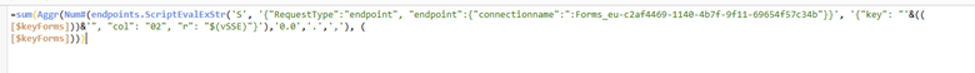 SET Forms.sum = Sum(Aggr(endpoints.ScriptEvalExStr('S', '{"RequestType":"endpoint", "endpoint":{"connectionname":":Forms_'&($1)&'"}}', '{"key": "'&($2)&'", "col": "'&($3)&'", "r": "$4"}'), $2));